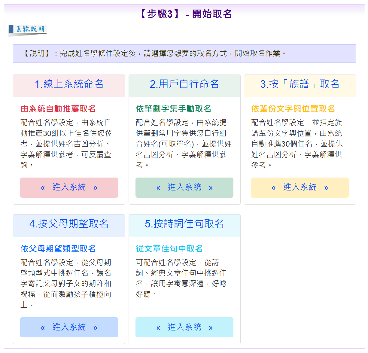 劍靈命名系統提供多種取名方式,包含線上系統命名、用戶自行命名、按「族譜」取名、按父母期望取名、按詩詞佳句取名,您可以依照自己的需求,選擇適合的命名方式。