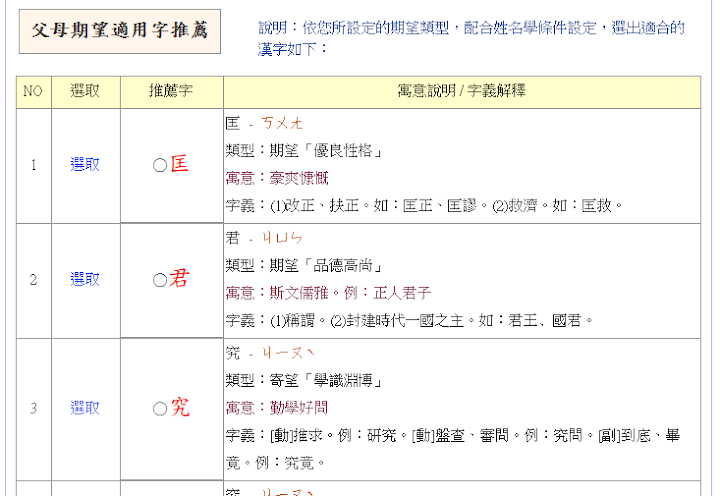 【步驟1】 - 選擇適用字:系統會依您所設定的期望類型,配合姓名學條件設定,選出適合該期望類型的漢字,並列出寓意說明、字義解釋供您參考。