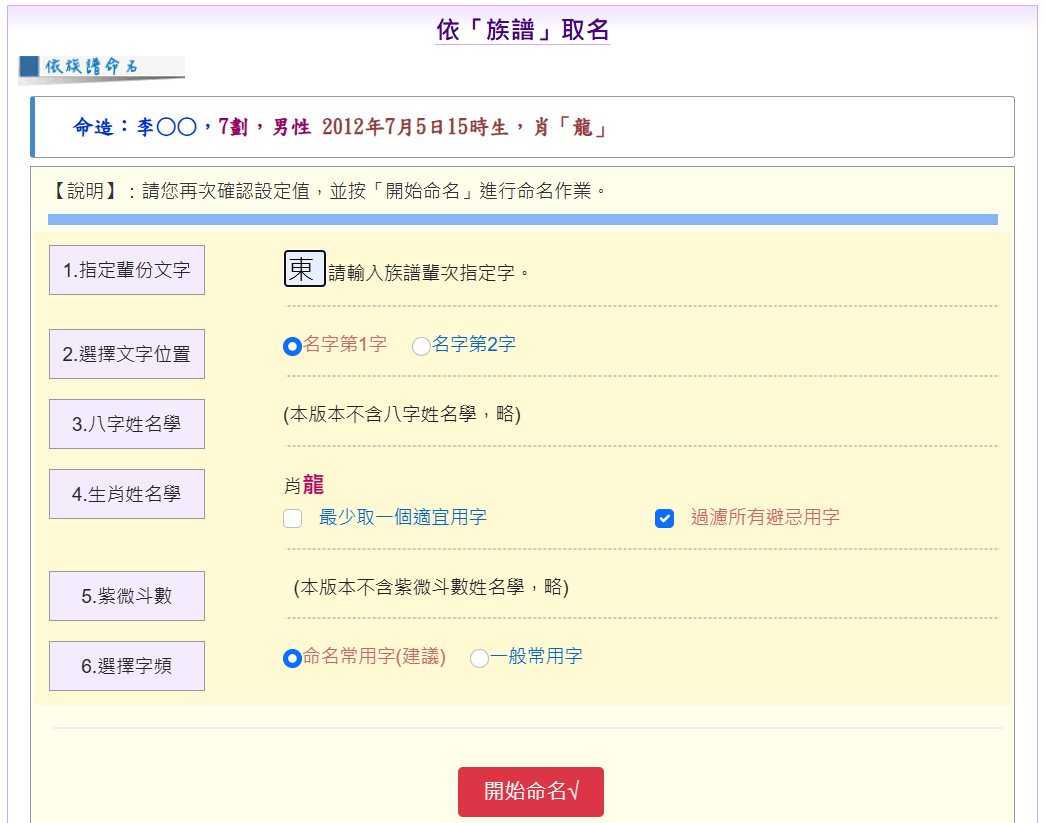 【說明】:確認姓名學條件設定無誤後,按「開始命名」鈕即可開始取名。