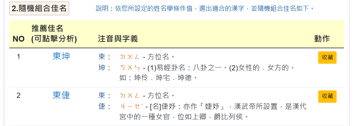 B. 隨機組合佳名推薦:依您所設定的姓名學條件值,選出適合的漢字,並隨機組合佳名。
